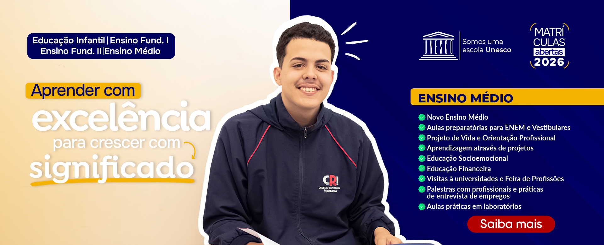 Essa receita de sucesso que o CRI apresenta é a conjugação de um quadro de professores excelentes (habilitados e capacitados, especialistas e buscando sempre renovar com cursos e pós-graduações, para acompanhar as transformações do ensino do século XXI), a determinação dos alunos, direção, coordenação e os demais funcionários. O resultado não podia ser diferente, somos hoje um dos colégios com maior índice de aprovação nos vestibulares e no ranking no ENEM, dentro da cidade de São Paulo, estamos na 53ª colocação. Para o Rumo Inicial Objetivo, não basta ter uma ótima estrutura e professores competentes, é muito importante o aluno conhecer o seu papel e executá-lo bem.